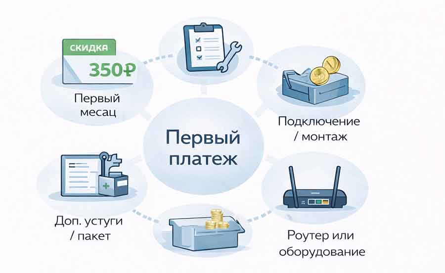 Стартовая сумма почти никогда не равна просто “цене тарифа”. Обычно это несколько разных элементов, которые складываются в первый платеж. Сюда может входить оплата первого месяца, оборудование, дополнительные услуги, а иногда и монтаж, если он выходит за стандартный сценарий.